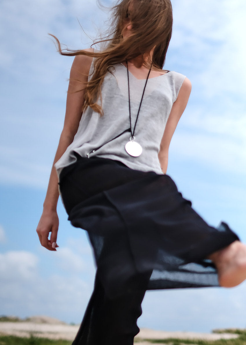 This top is like the sexy alter ego of the Miaou Top, complete with a playful halter back. With a wide V front neckline and open halter back, it's perfect for pairing with a matching bra or bustiere. Its lightweight and slightly sheer texture adds a touch of whimsy to any summer ensemble - ideal for layering and dreaming big! Fits sizes XS/S, M, and petite L.