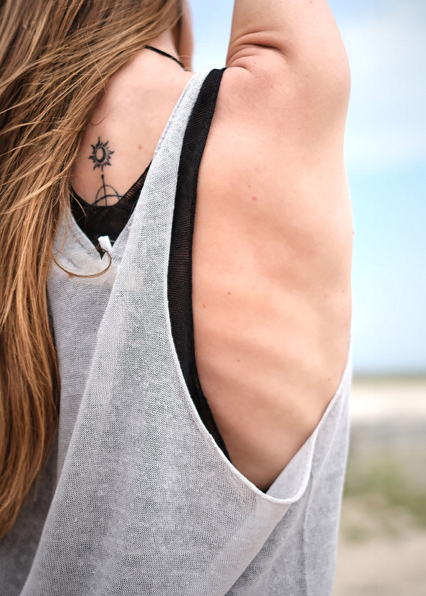 This top is like the sexy alter ego of the Miaou Top, complete with a playful halter back. With a wide V front neckline and open halter back, it's perfect for pairing with a matching bra or bustiere. Its lightweight and slightly sheer texture adds a touch of whimsy to any summer ensemble - ideal for layering and dreaming big! Fits sizes XS/S, M, and petite L.