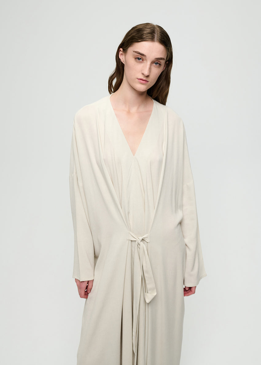 Long oversized dress with long sleeves and a V-neckline, made of a soft viscose/wool blend fabric. AUTOR features an integrated belt in the same fabric for adjustable sizing.