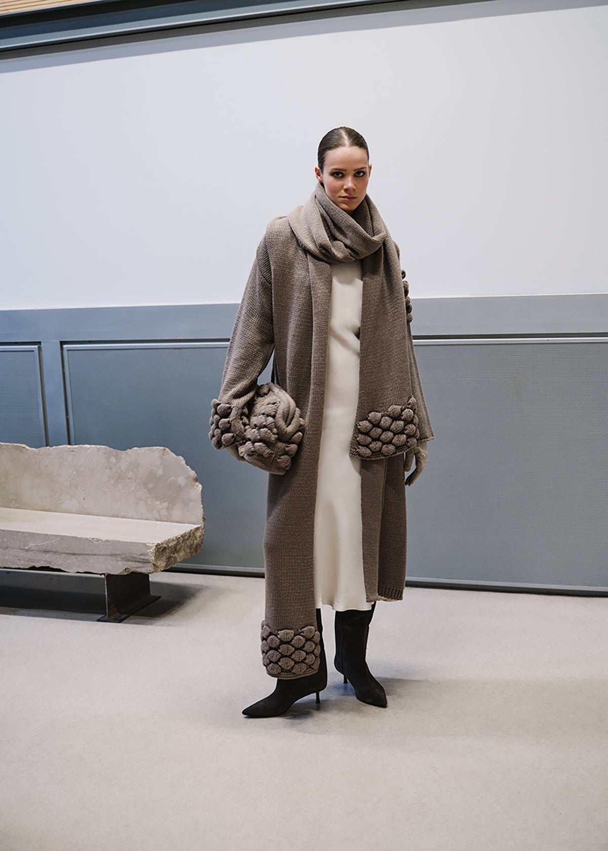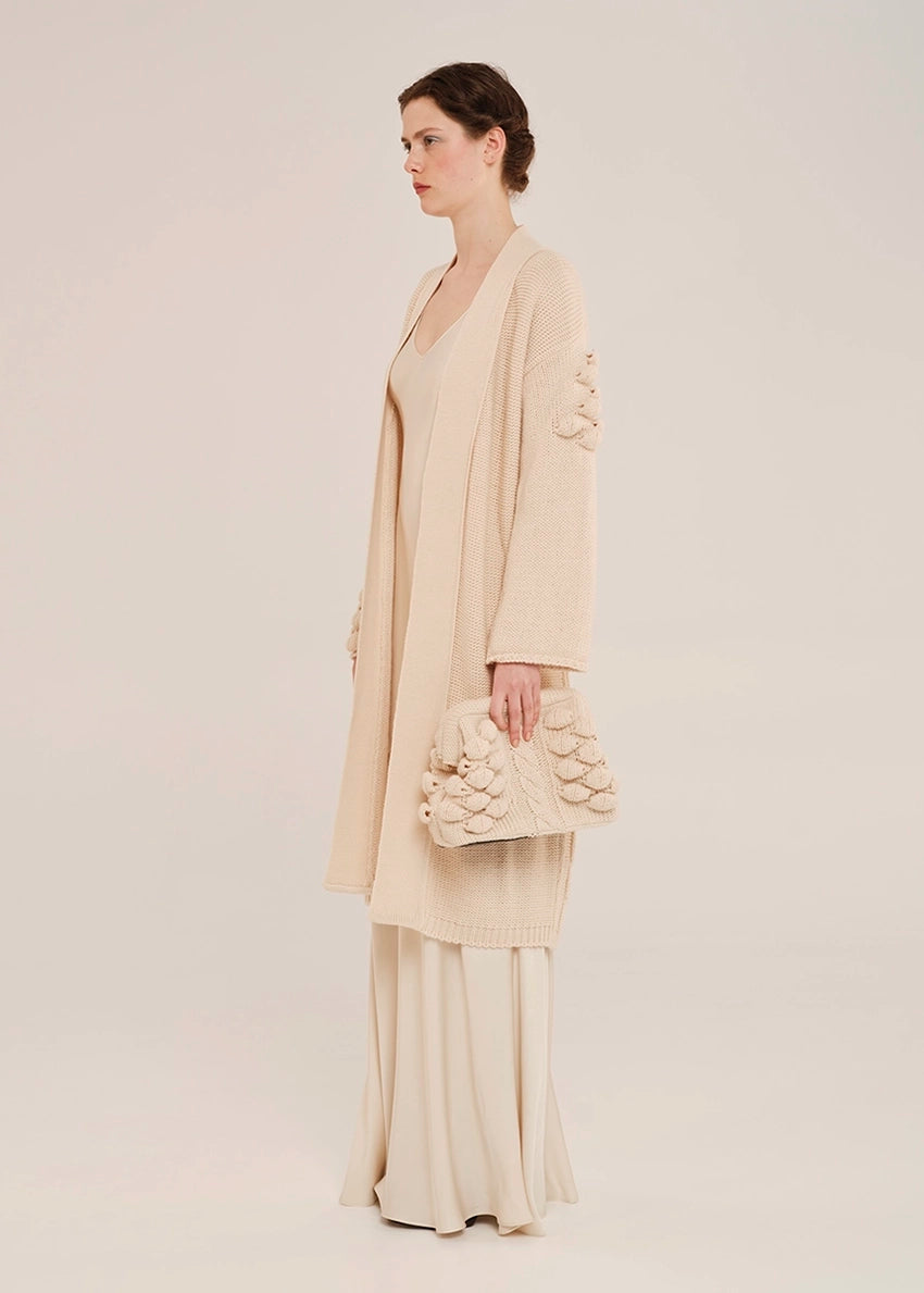 Long knitted cardigan made from a wool blend with a soft, cozy texture. It features long sleeves and a straight cut that gently drapes over the silhouette. Decorative bobbles on the sleeves and a striking cable knit detail at the back add character and uniqueness to the design. Perfect for stylish and cozy looks during the colder months.