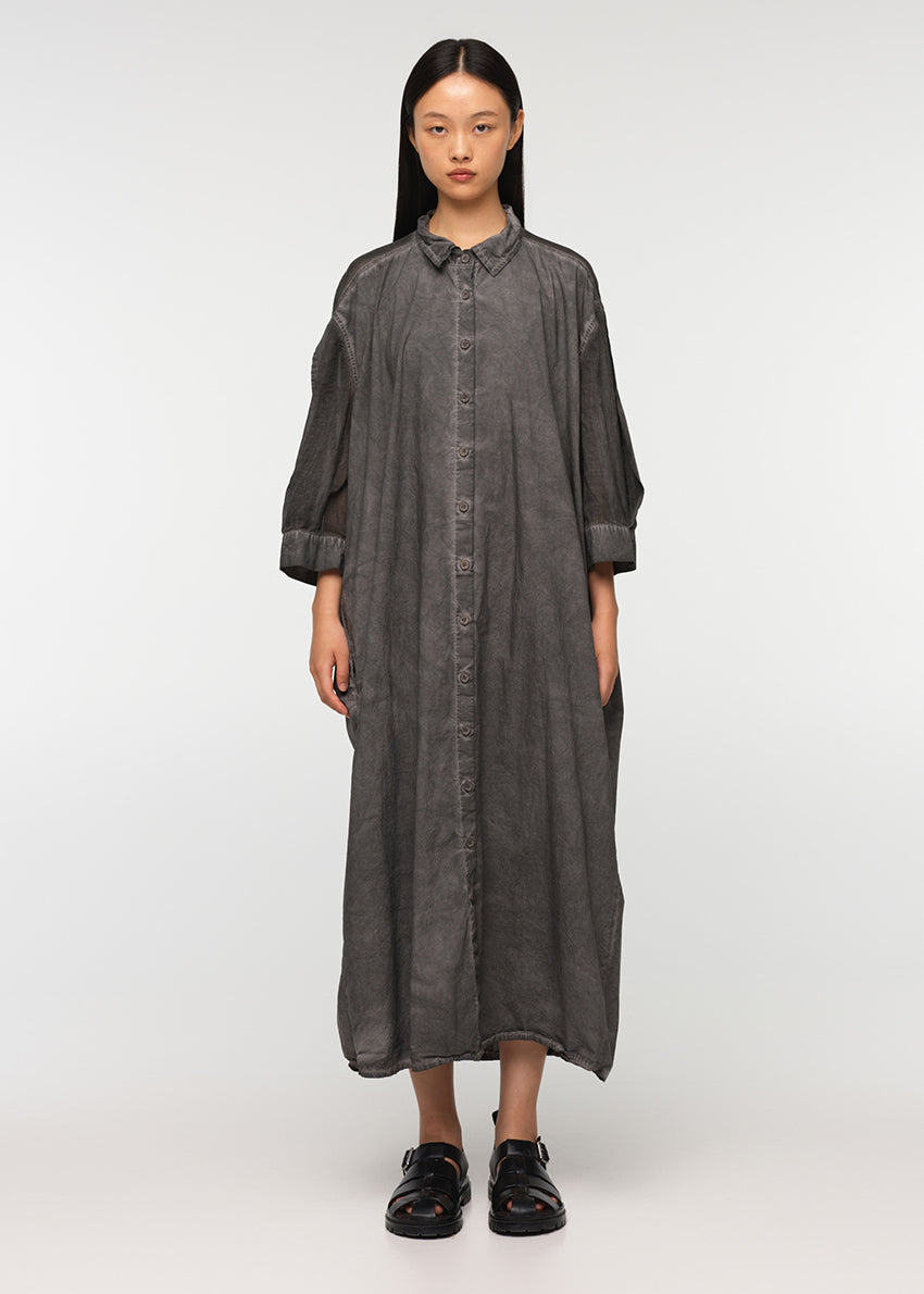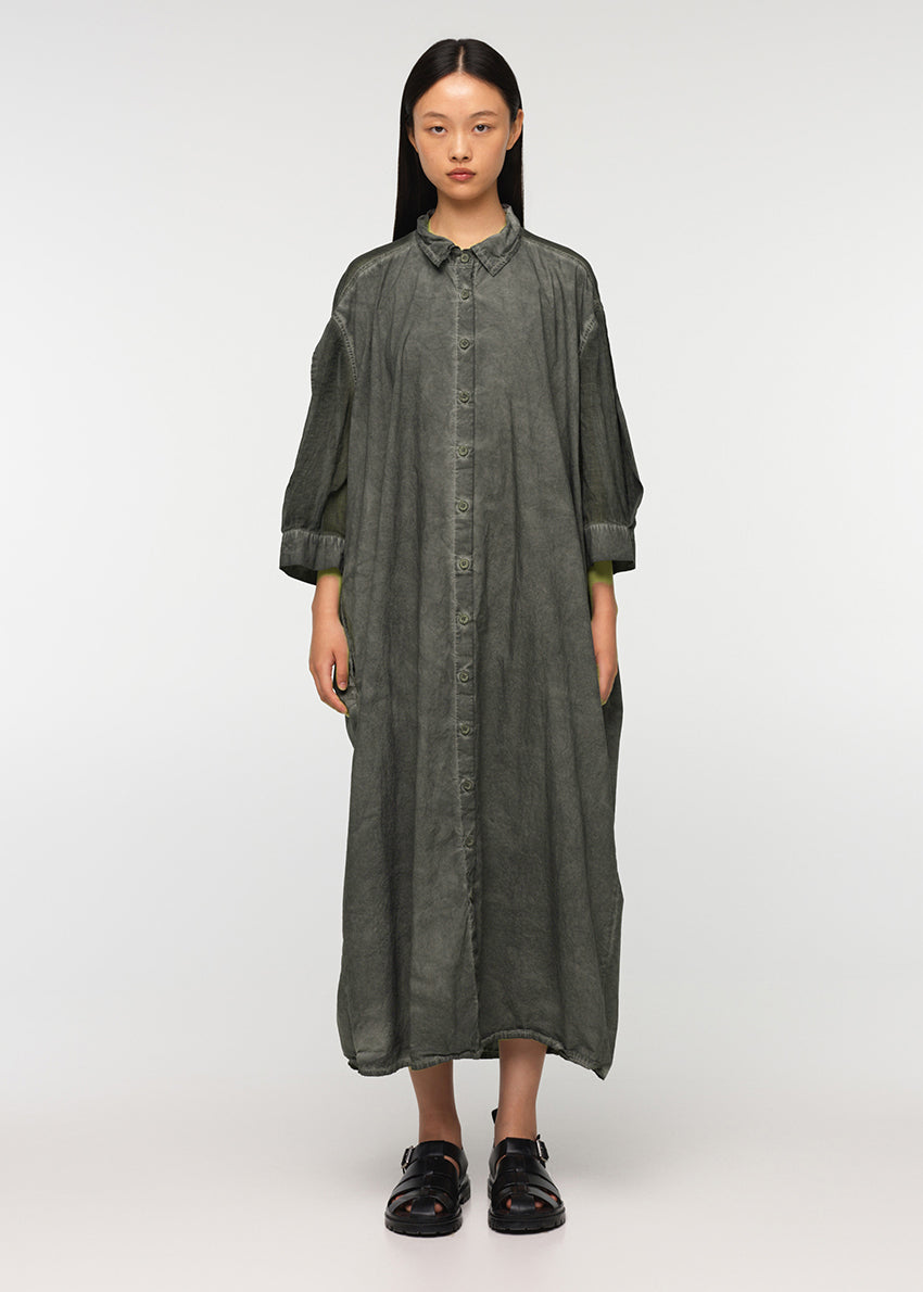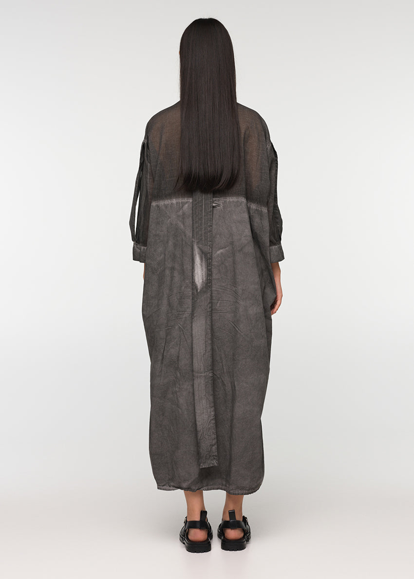 Long dress, in a loose fit, made from soft cotton poplin and cotton voile, featuring a collar and 3/4-length sleeves. SUNSET shirt fastens at the front, with buttons on a concealed placket, includes a decorative vertical belt at the back, and two side pockets. The garment has undergone a special cold-dyeing process, and therefore there may be variations in colour, size, and shape.