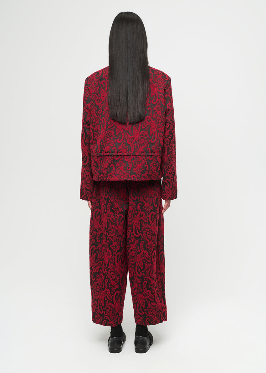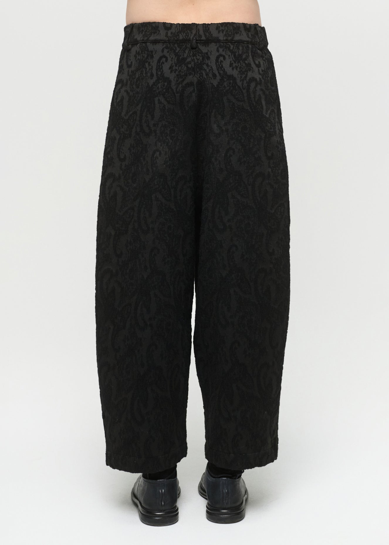 Unisex, midi, wide trousers with a low crotch, tapering towards the bottom, made of blended wool brocade fabric. Poema features a fixed waistband with elastic at the back, side pockets, and two front pleats.