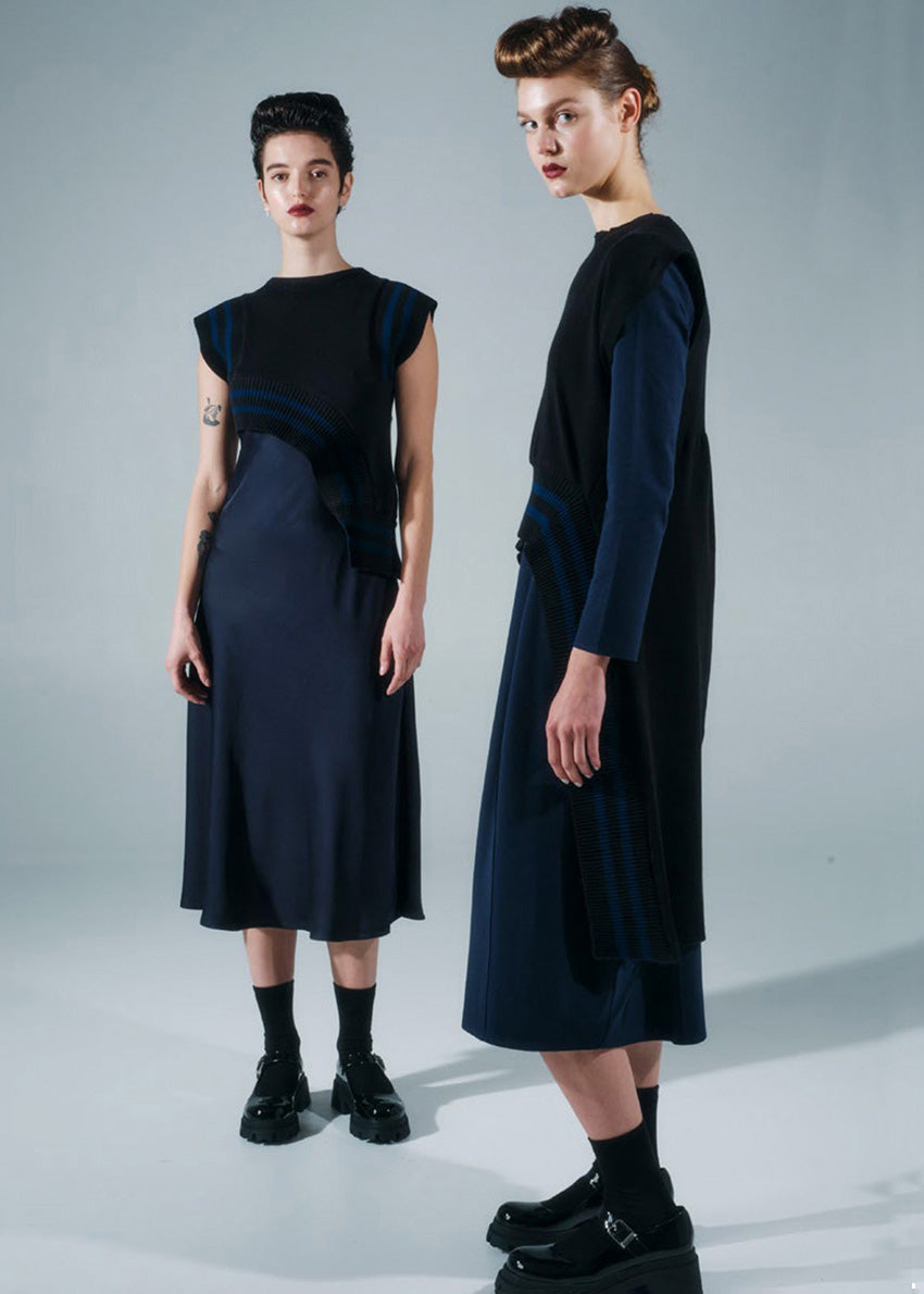 This is a sculptural knit top in cotton, designed with an architectural silhouette and subtle contrast detailing in black and deep blue.
