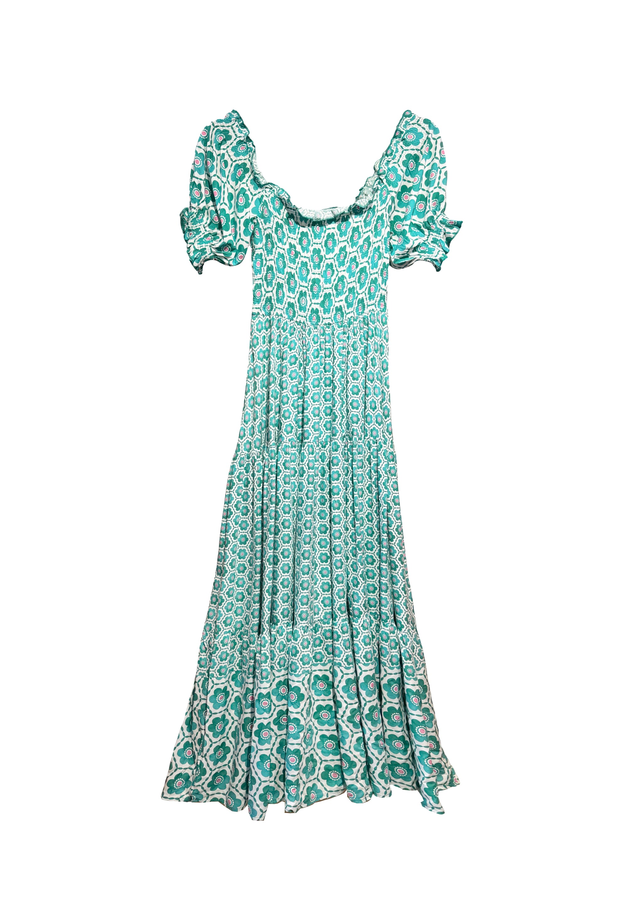 This tiered maxi dress features elastic cuffs and a flattering fit, crafted from 100% Rayon for a comfortable and breathable wear. Perfect for various occasions, the vibrant print and flowing silhouette make it an ideal choice for an effortlessly chic look.